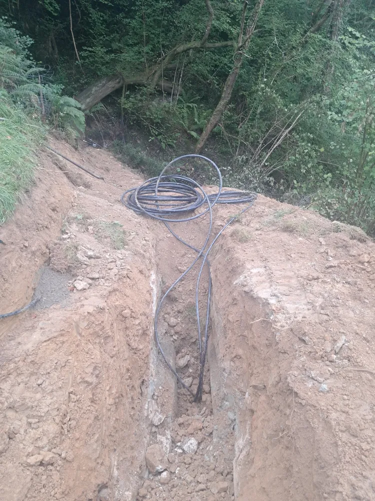 Ouverture de tranchées et posent des tubes PEHD (pour l'arrivée d'eau, le trop plein, la vidange et l'alimentation du réseau d'eau potable).