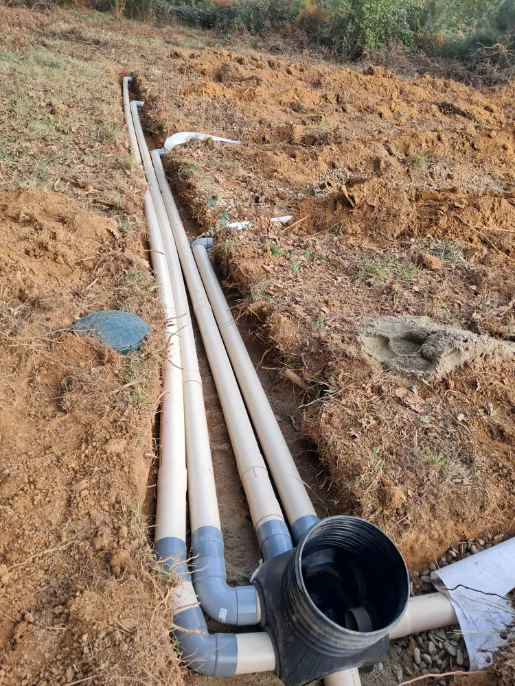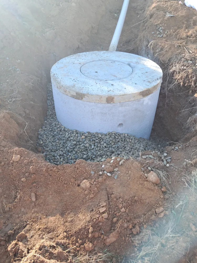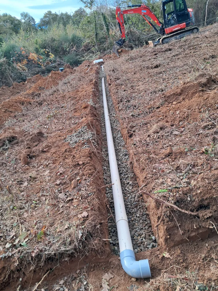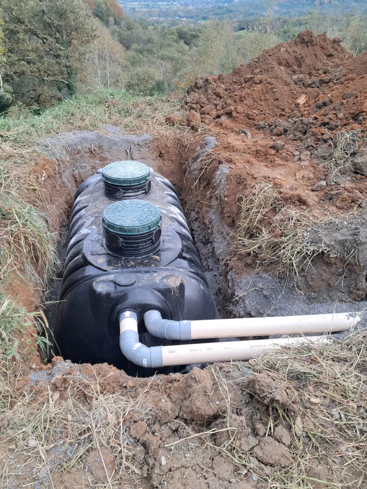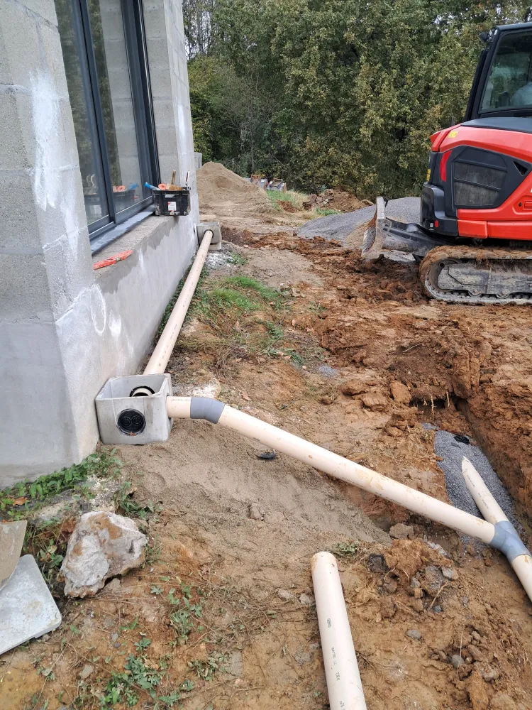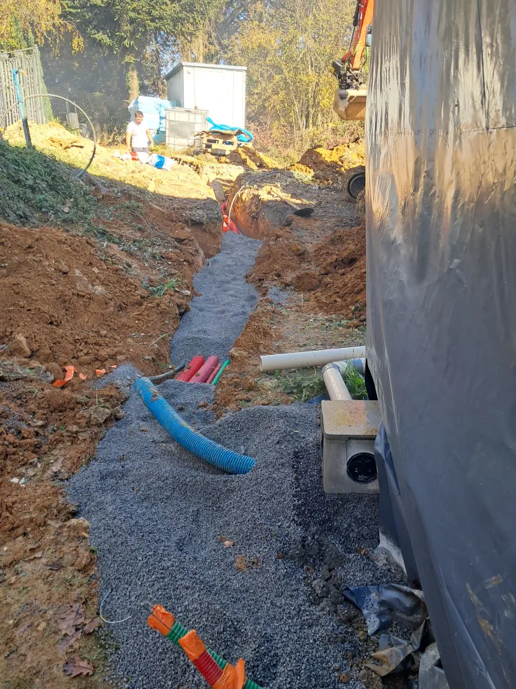 Pose d'une fosse septique et raccordement des évacuations.