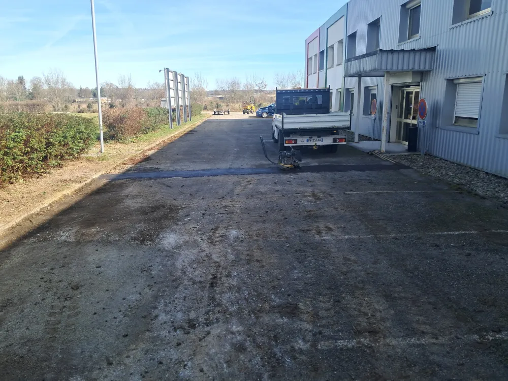 Mise en place de caillou sur le parking et d'enrobé à froid par dessus.