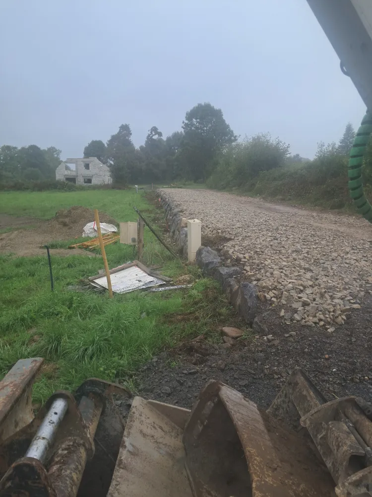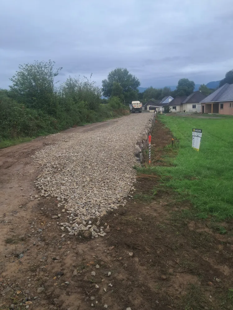 Mise en place de cailloux pour rattraper le niveau de l'assiette de la route.